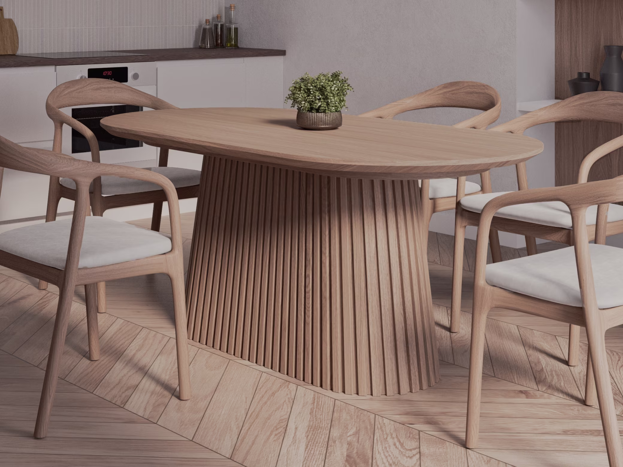 Tabletop material: Natural oak veneer (1.5 mm) on a wood-based board core, ensuring dimensional stability.